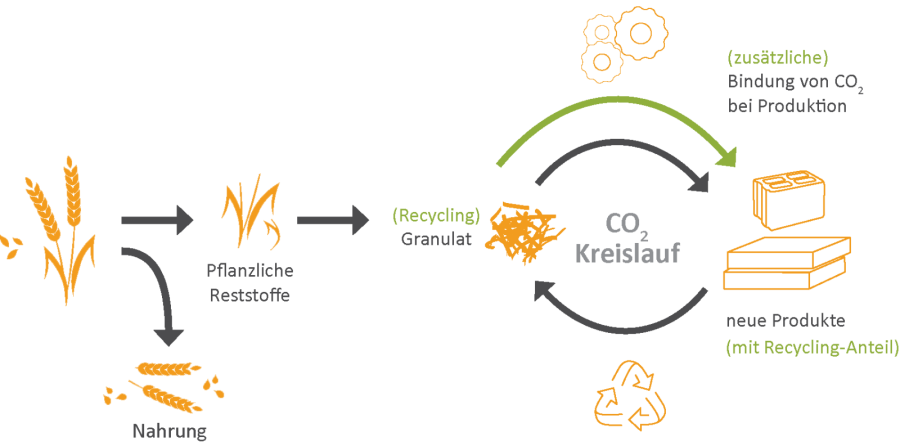 Durch die stoffliche anstatt der energetischen Nutzung leisten wir einen wichtigen Beitrag zum Umweltschutz, da bei der Herstellung von Stroh- und Recyclingplatten große Mengen an CO2 gebunden werden.